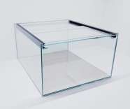 6mm Floatglas,Versiegelung mittels hochwertigem transparentem Aquariensilikon, Kanten matt geschliffen, 2 verschiebbare Abdeckscheiben in einem Kunststoff doppel U-Profil liegend, davon eine Scheibe mit Technikausschnitt unter 45° für Kabel und Schläuche.