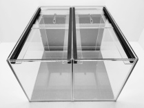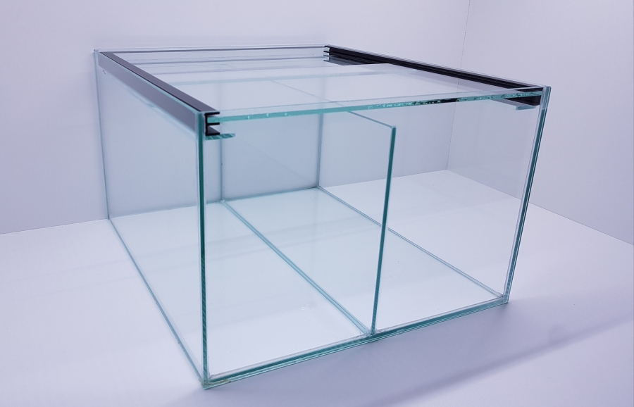 4mm Floatglas,Versiegelung mittels hochwertigem Aquariensilikon, Kanten geschliffen, transparentes Silikon, Trennscheibe mittig, 2 verschiebbare Abdeckscheiben in einem Kunststoff doppel U-Profil liegend, davon eine Scheibe mit Technikausschnitt unter 45° für Kabel und Schläuche.