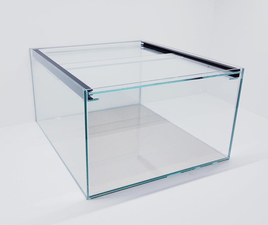 6mm Floatglas, Versiegelung mittels hochwertigem transparentem Aquariensilikon, Kanten matt geschliffen, 2 verschiebbare Abdeckscheiben in einem Kunststoff doppel U-Profil liegend, davon eine Scheibe mit Technikausschnitt unter 45° für Kabel und Schläuche.